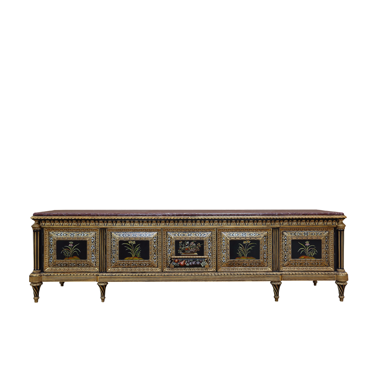 以英國溫莎堡的新古典風格長柜為設計靈感,絕美的植物彩繪和花朵蔓藤雕刻,撲捉溫莎城堡的淺谷繁花;英國皇室的雅致在彩漆的堆積中形象逼真地描繪出貴族家居生活美學的真諦。