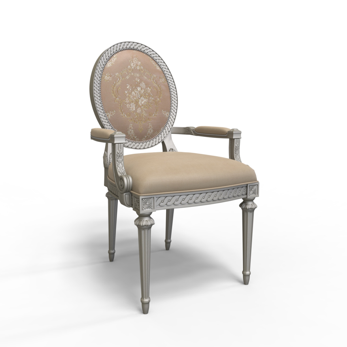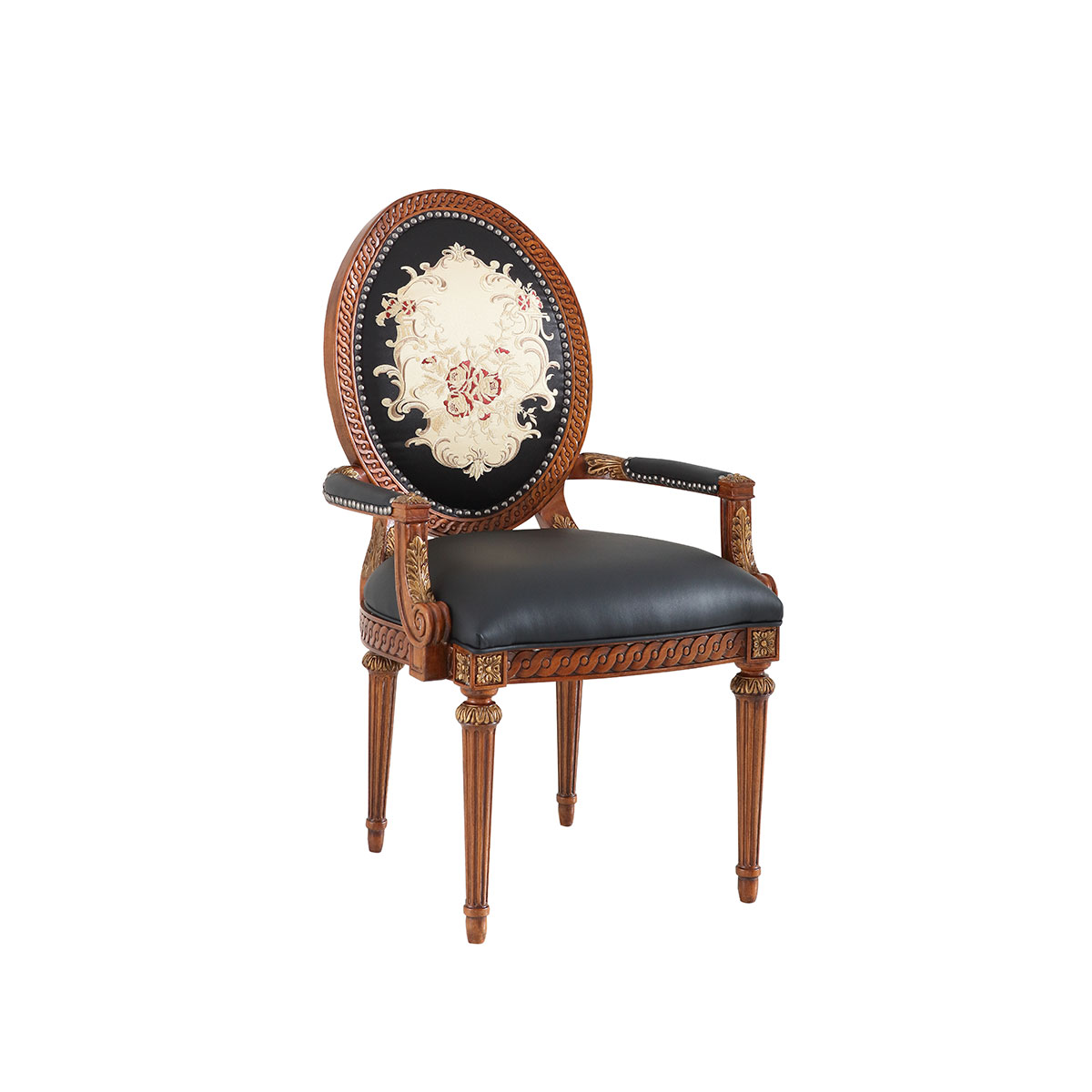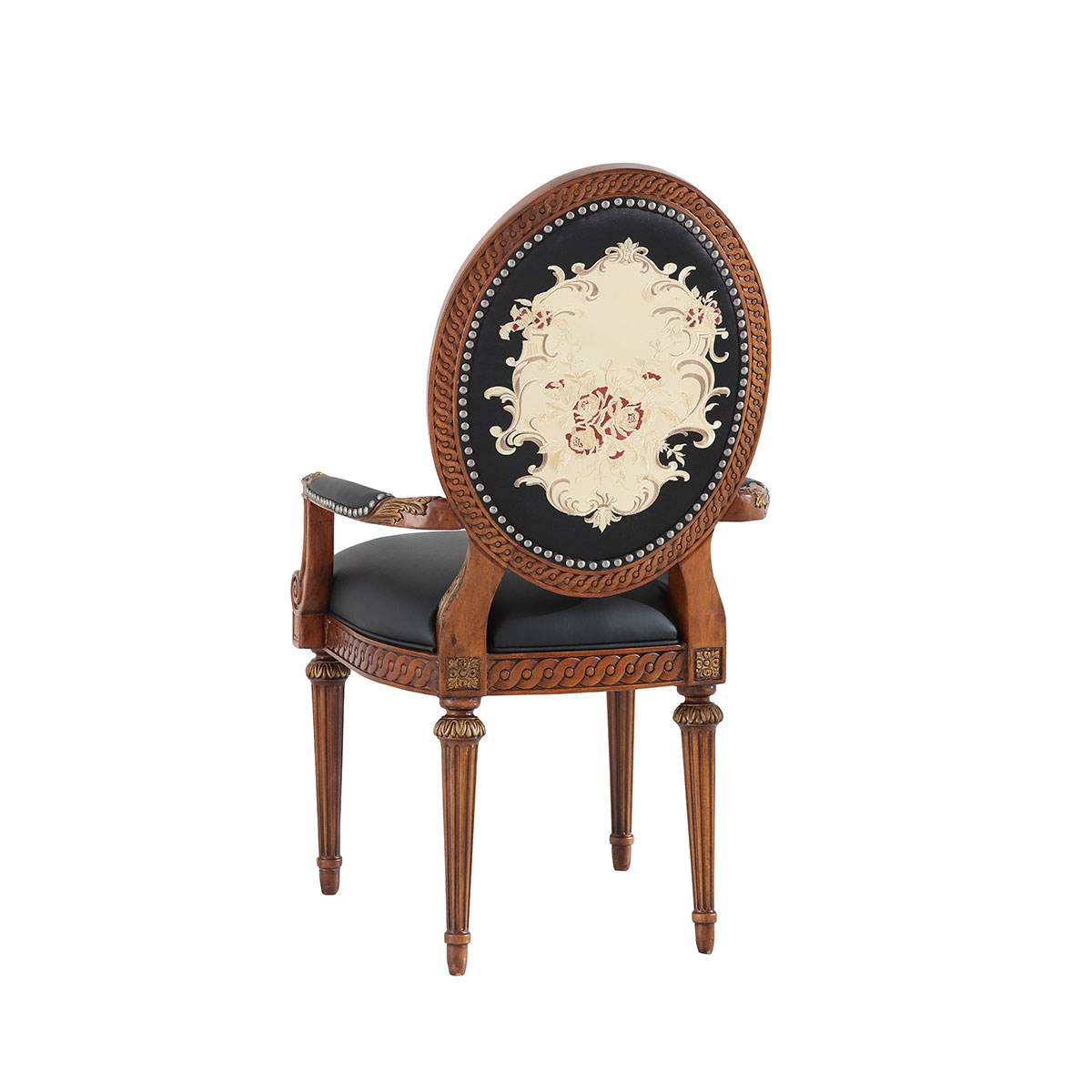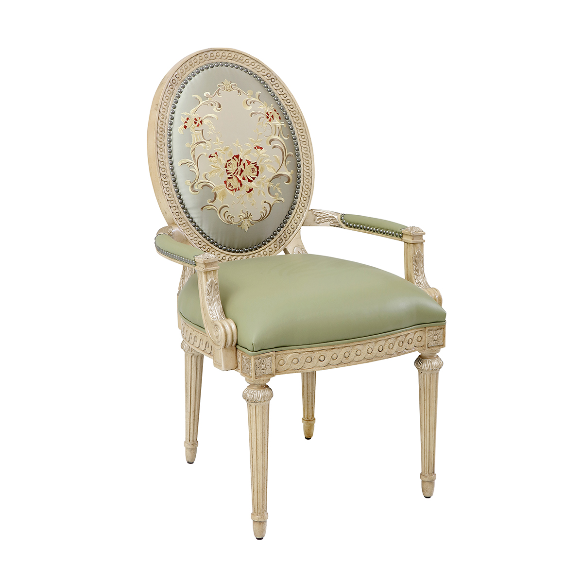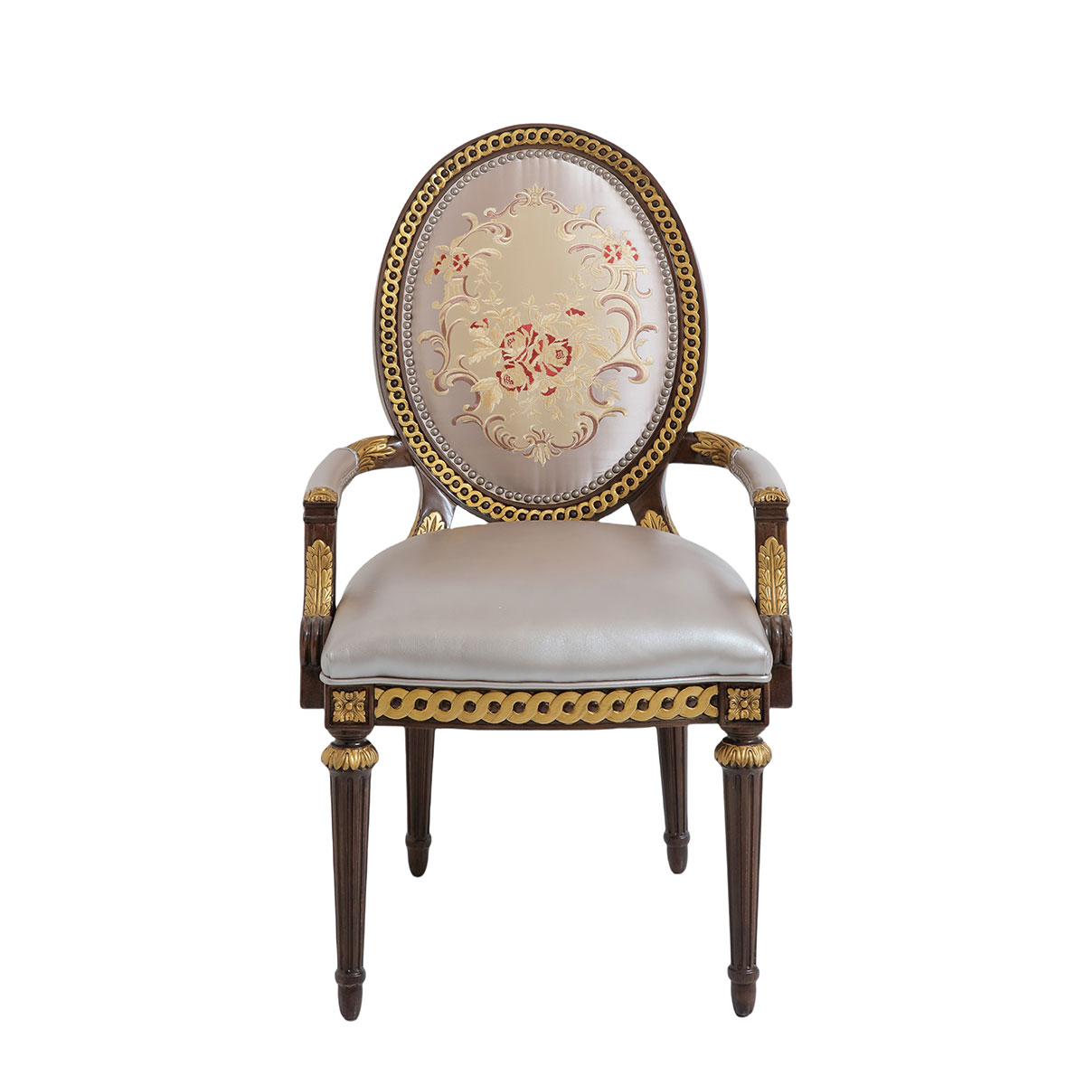 參考18世紀(jì)法國(guó)路易十六時(shí)期涂金扶手椅古董設(shè)計(jì),并結(jié)合同時(shí)期的圓面背板設(shè)計(jì)。配上精致的連續(xù)雕刻和貼金鉑工藝、錐形腳設(shè)計(jì)、觸感舒適的布藝和包有豐厚的填充物坐墊和靠背。