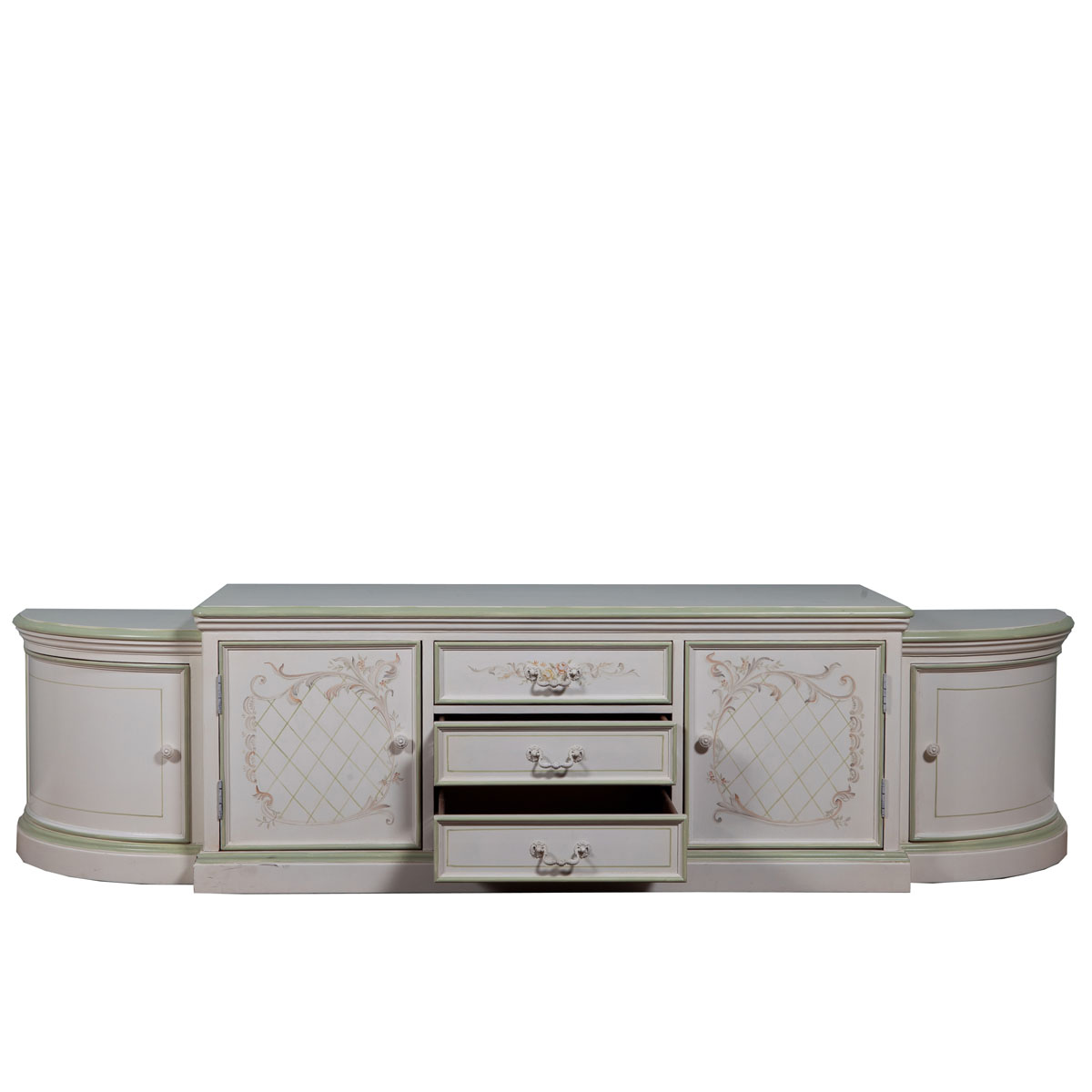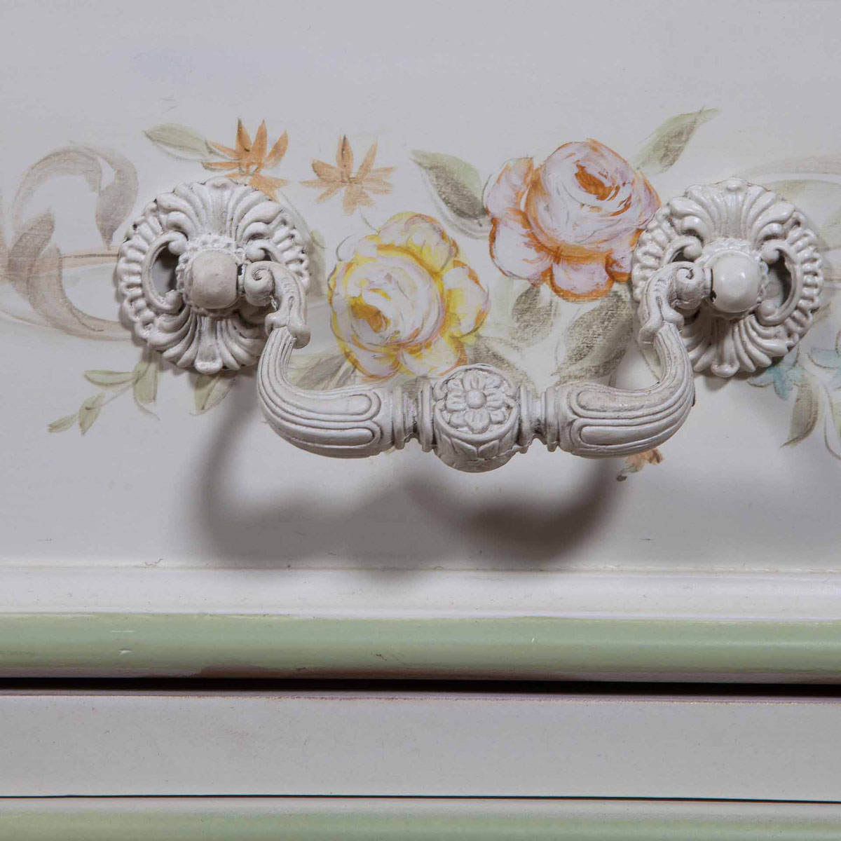 普羅旺斯的花海已折射在以花卉為主題的手工彩繪上,每一筆每一線都夾帶著花朵里的芬芳,法國的古董白跳躍著清新的復古美,與精致的彩繪相得益章,曲直結合的新古典主義造型與花藤抽手配搭更顯浪漫。