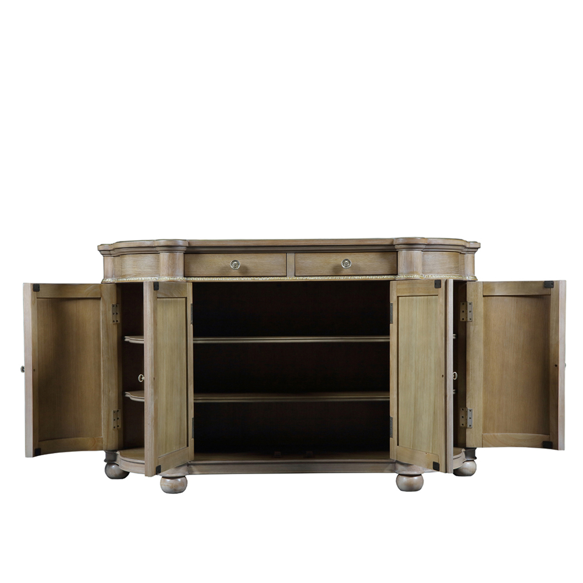 * 2個儲物抽斗,底部裝有經典的硬木實木滑軌。 * 所有門板均使用包邊合頁使門更牢固; * 底部裝有可調整腳釘。"