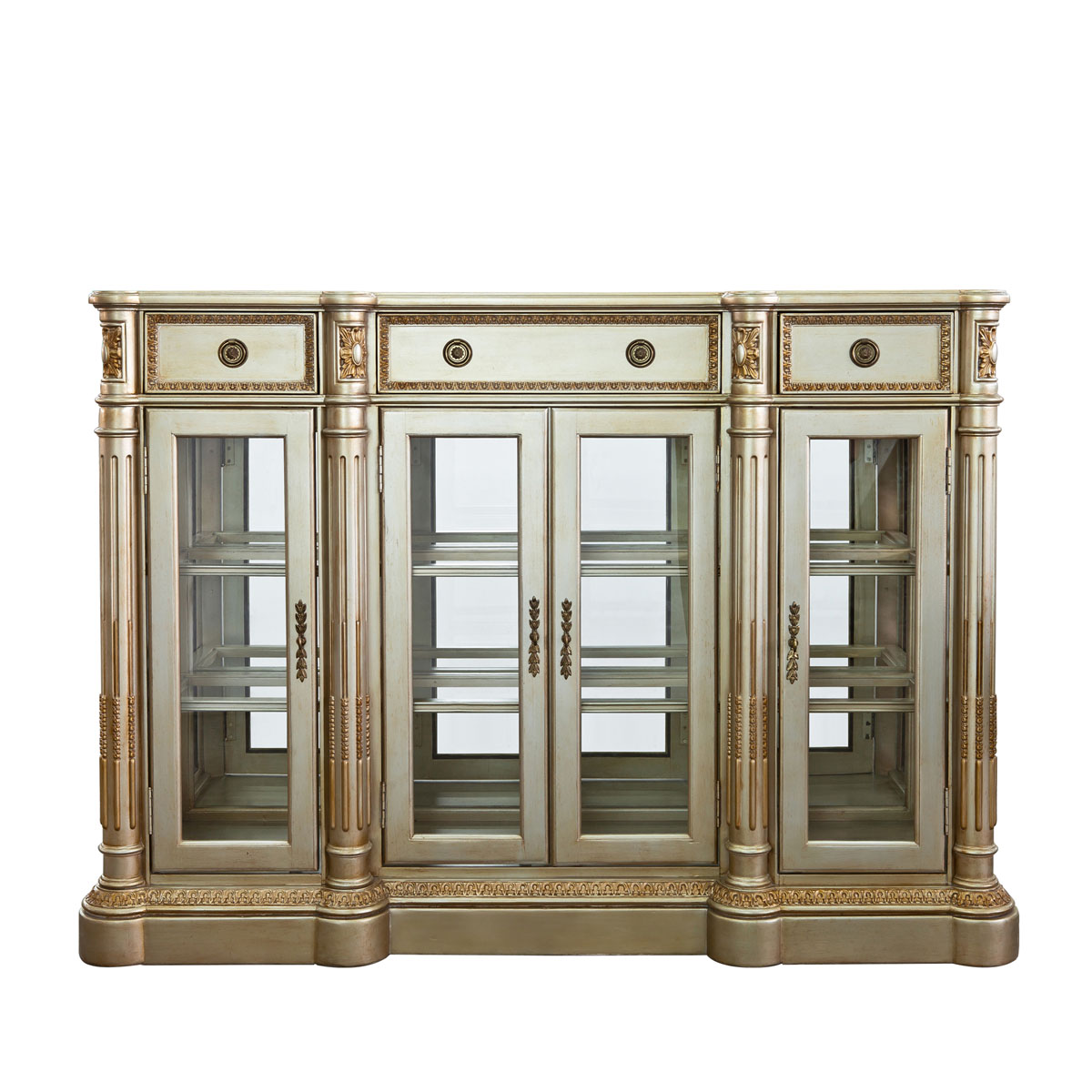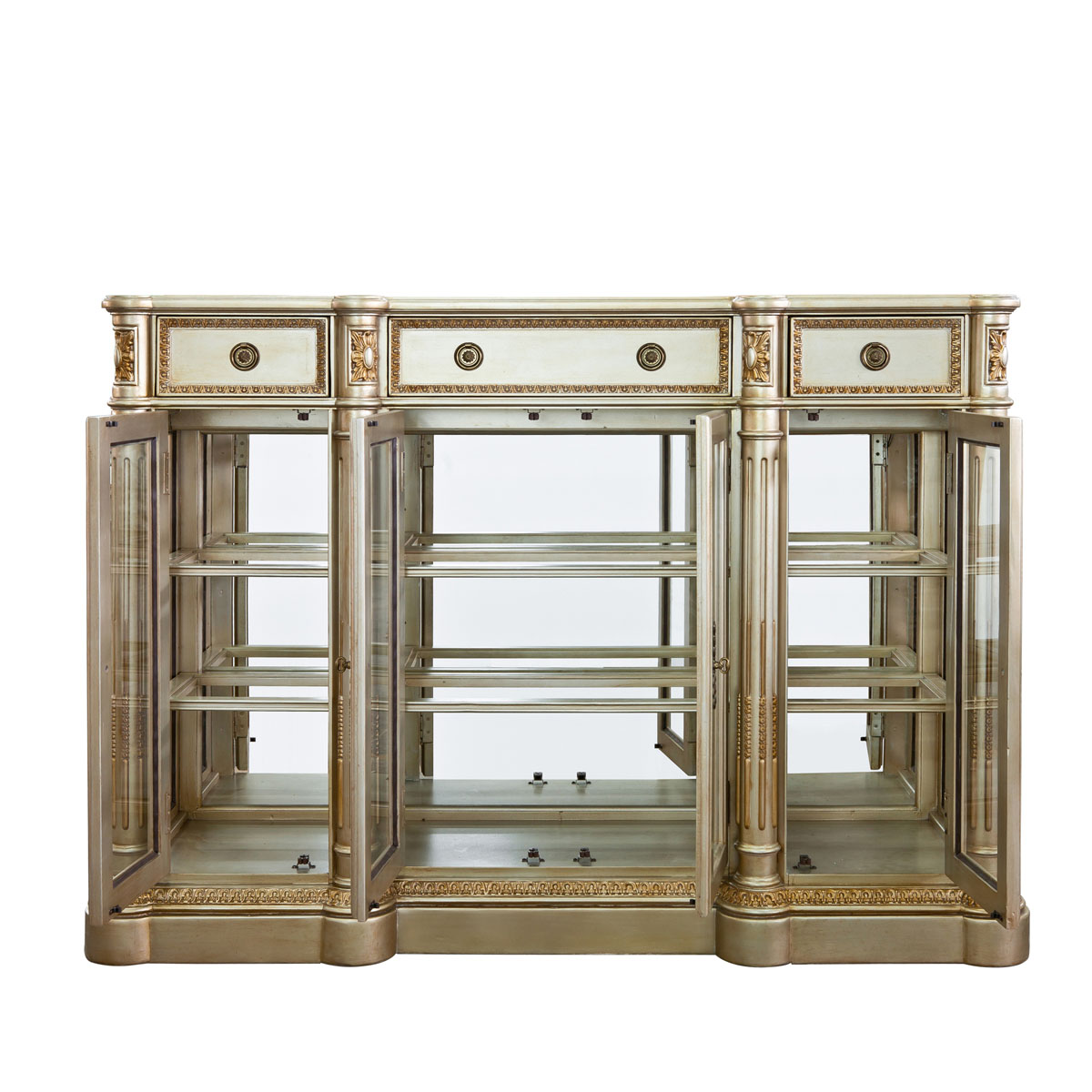 * 以法國路易十六時期的古董家具為設計基礎,采用同時期的建筑柱元素和耀眼奢華的網眼圖案、金箔貼飾,使其充滿了法式宮廷的優雅與華麗,充分詮釋了18世紀法式家具融合建筑與家具設計的藝術特點。