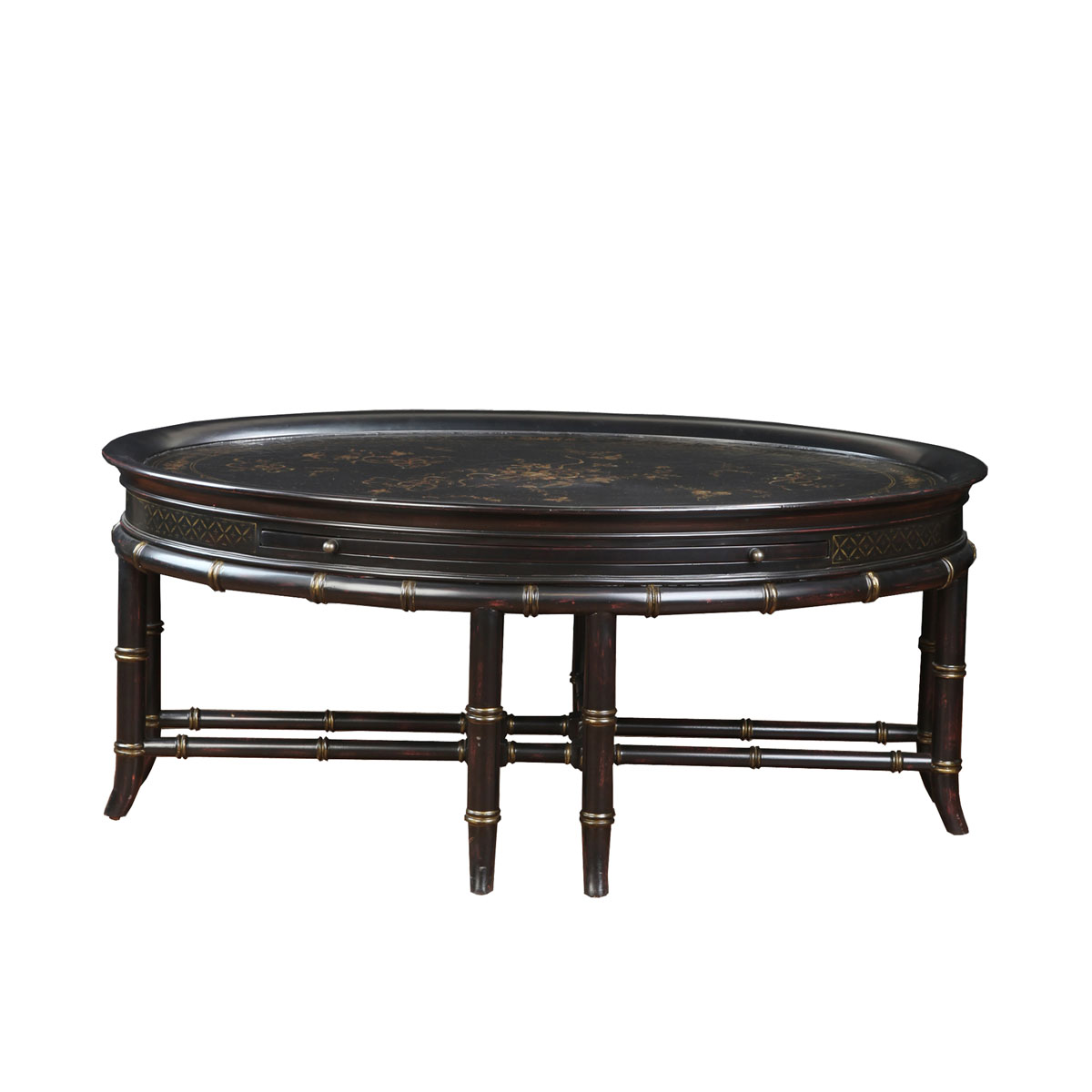 * 以18世紀(jì)英吉利——“日不落帝國”為設(shè)計主題,把東西方的多種藝術(shù)元素結(jié)合在一起。有來自東方意念的竹子造型車枳柱和高貴的黑底金漆配搭;也有參考東方山水畫的手繪植物圖案。配上托盤式面板設(shè)計,是經(jīng)典系列英吉利經(jīng)典英式橢圓咖啡桌的特色。