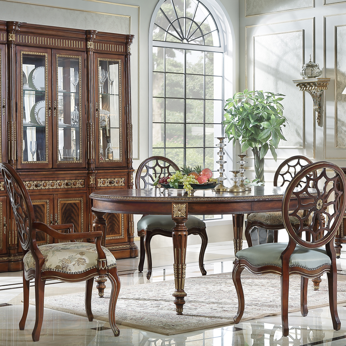 * 為表現法國路易時期的莊嚴和浪漫,以法國凡爾賽宮為設計元素。使用歌頌路易十四時期的太陽花雕刻,顯示其王權穩固地位的錐形腿腳設計;配以鉆石圖案木皮貼面、可調節的伸板設計和貼金工藝,完美演繹了法式宮廷家具的奢華尊貴。
