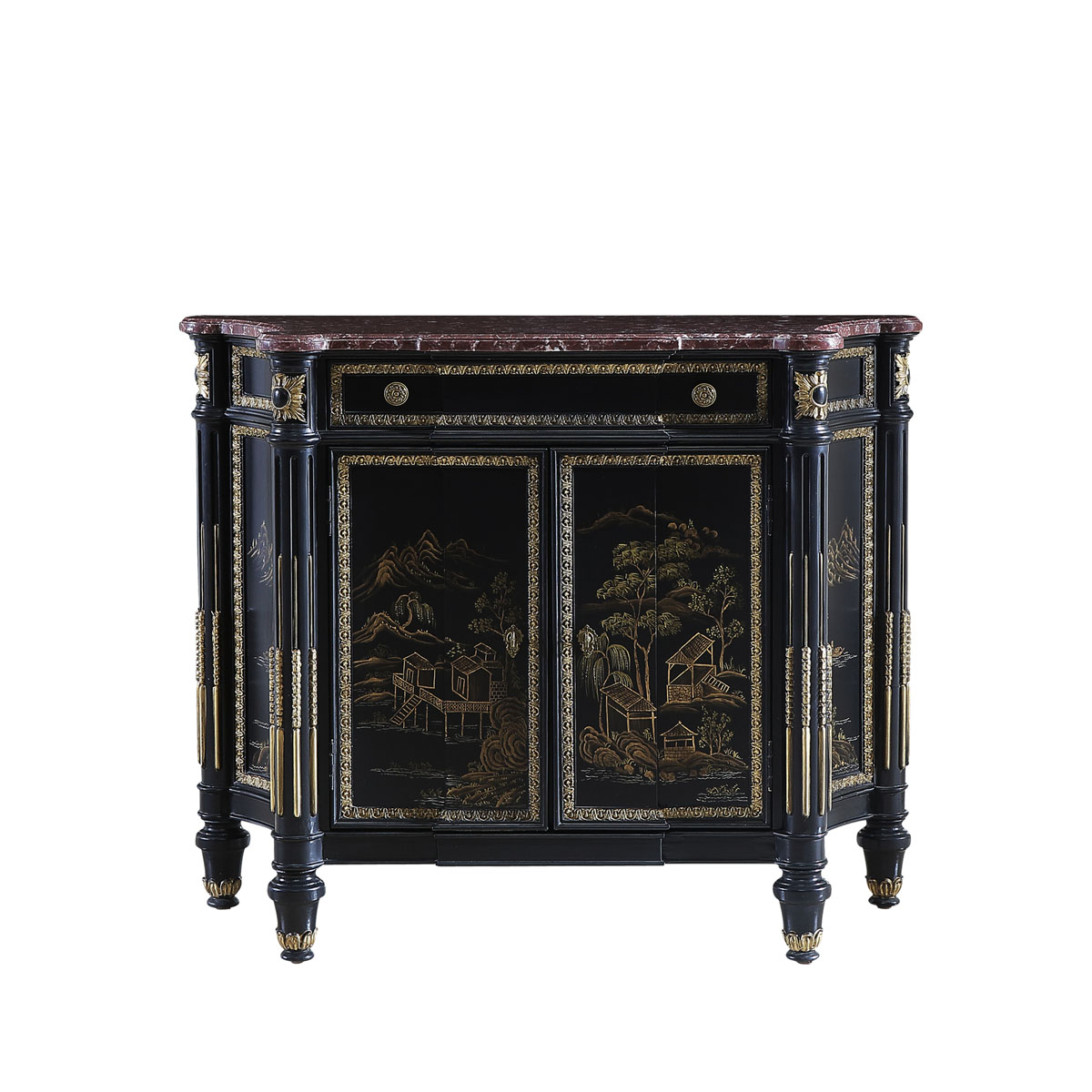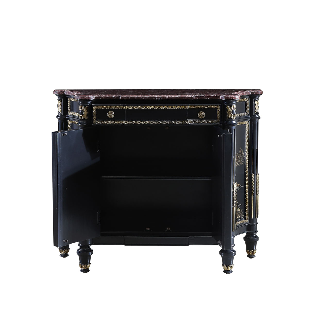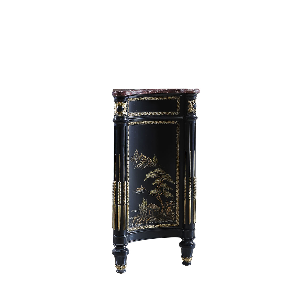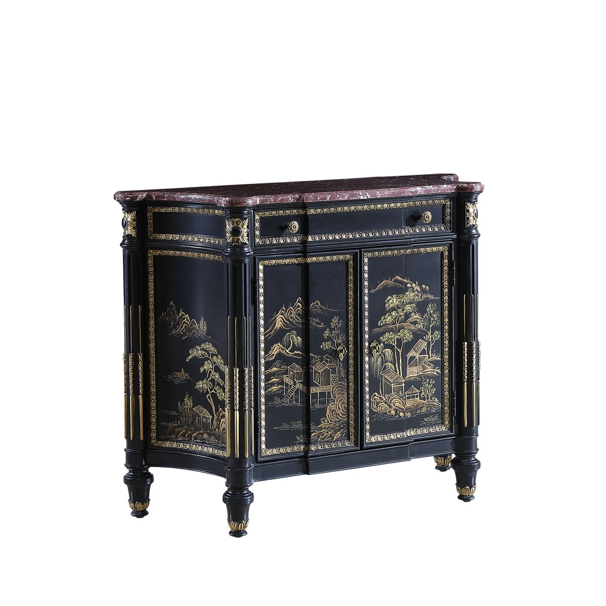 * 為表現法國路易時期的莊嚴和浪漫,以法國凡爾賽宮為設計元素。使用歌頌路易十四時期的太陽花雕刻,配以建筑柱雕刻、優雅的黑底金漆中國山水手繪與大理石材質,完美演繹了法式宮廷家具的奢華尊貴