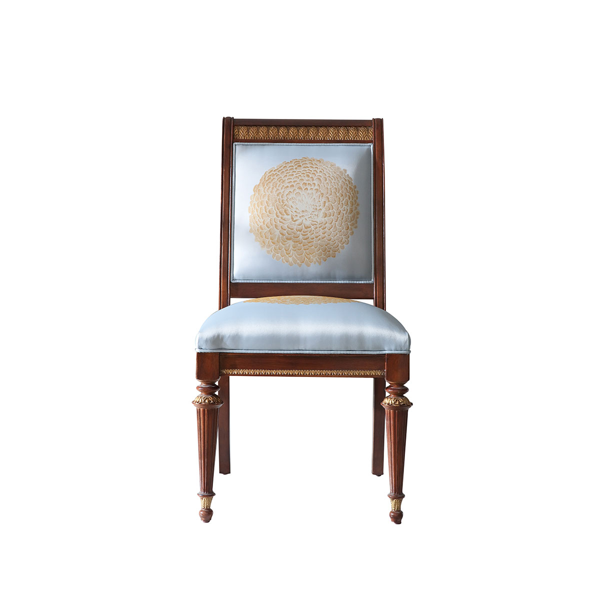 * 以17世紀意大利帝國EMPIRE風格為設計元素,結合意大利人重生活懂藝術的品位追求,使用代表榮譽的月桂葉型雕刻和錐形的腿腳設計、精致的手工雕刻細節和描金工藝,以顯示王權的穩固地位;搭配以意大利國花 ——雛菊為意念的金菊圖案,還有布藝和厚實柔軟的填充物,精彩展現了意式家具奢華絢麗而又極富藝術人文氣息的迷人魅力;
