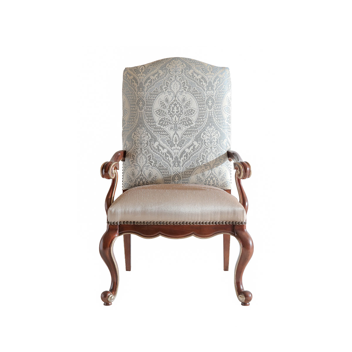 一款集合法式元素包括Camelback Silhouette(駝峰輪廓)造型、旋渦形扶手和S形彎腳的高背休閑椅,并配上觸感舒適的布藝和包有豐厚的填充物坐墊和靠背。