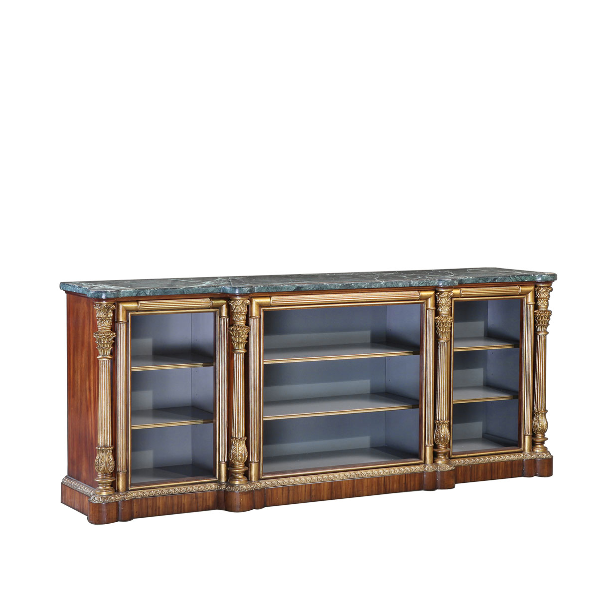 * 這是設計意念來自于英國溫莎堡中喬治三世時期的走廊柜。臺面采用云石做裝飾,借以表達喬治三世王權的堅不可摧。使用以華麗莊嚴的 Corinthian Order(科林斯式羅馬柱)為原型的雕刻柱,配上細膩的木皮貼面和貼金箔工藝,充分展現了英式古董家具的絕世芳華。