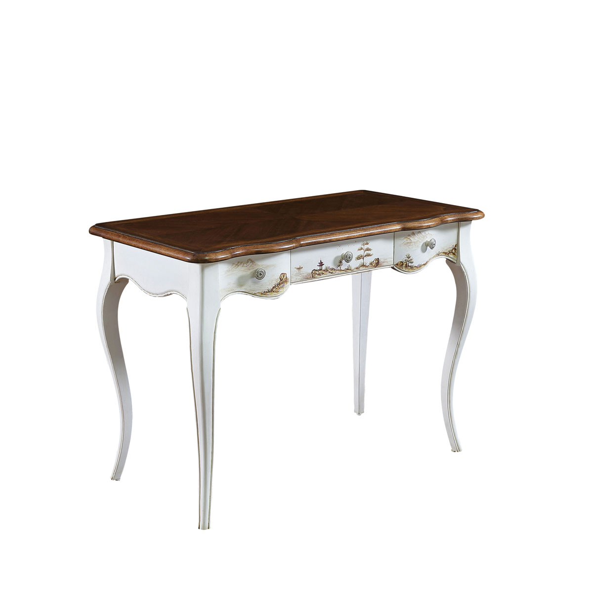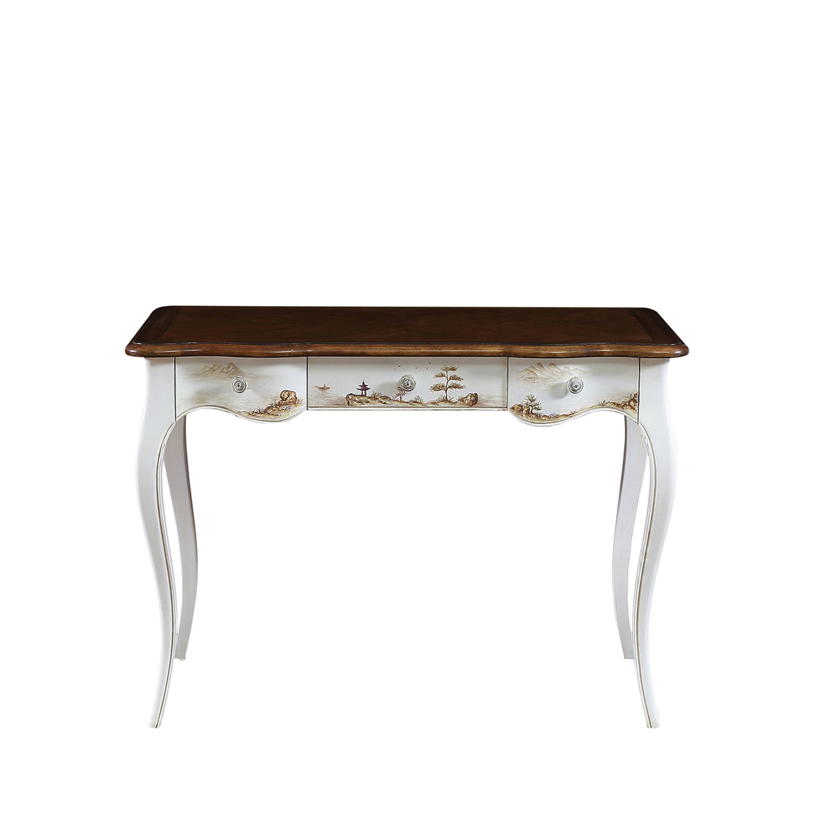 * 在法式仿古白油漆上,手繪上山清水秀的中國山水畫,讓一切都回歸自然的簡潔淡雅;抽屜的線條型設(shè)計與優(yōu)雅的法式彎腳完美契合, 再配以猶如晨陽的實木簿片拼貼工藝, 盡顯普羅旺斯的休閑愜意。