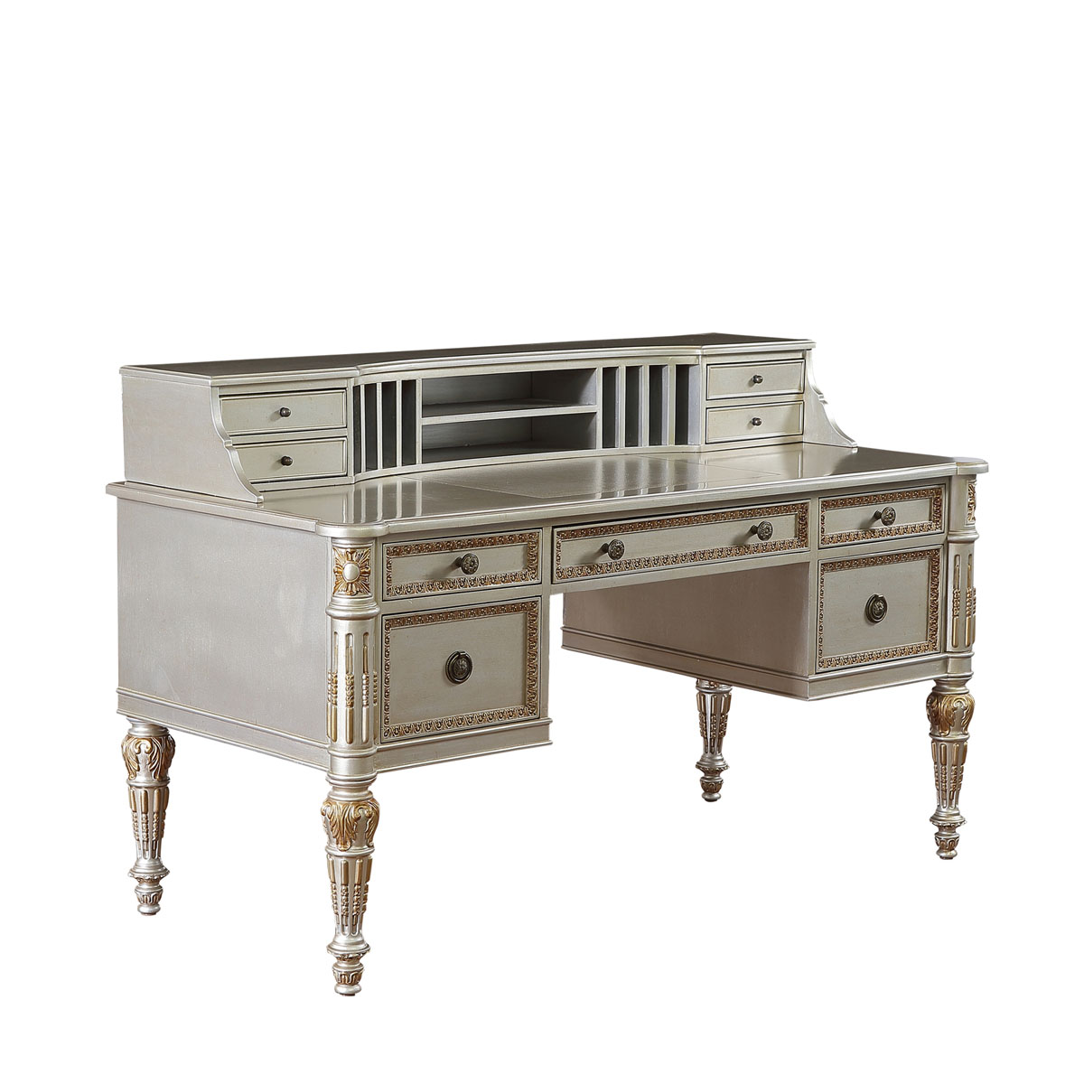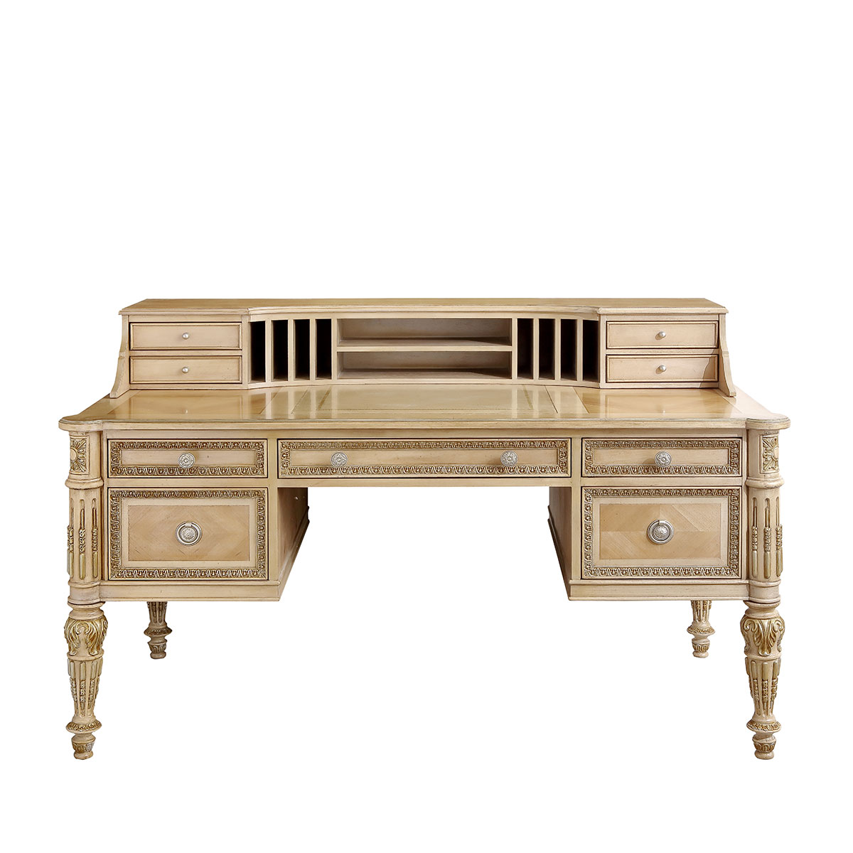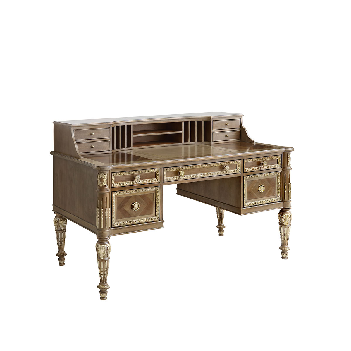 * 女主人關于美的秘密,或許只有梳妝臺知道。卷葉植物與直線凹槽裝飾的錐形腳,象征著皇室的卓越品味;華麗金箔貼飾和鉆石形拼花圖案,傳遞出奢華浪漫的專屬風格;而豐富的小抽屜與層格設計,則用實用功能向玲瑯滿目的化妝品與珍寶首飾致敬.