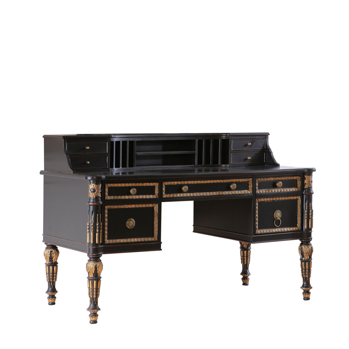 * 手工雕刻的工藝細節; 結實的連接技術; * 可作寫字桌使用,其擁有4個抽斗,上方2個斗可配合鼠標板使用;中央為翻斗,內有線孔,可與鍵盤配合使用; * 桌面有4個小收納抽斗和豎隔板的小空間