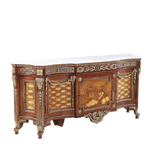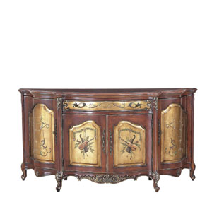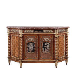 * 以法式門窗為設計意念, 使用窗格花和拱頂設計, 將東方的意韻與西方的韻味相融合,充分展現了生活藝術的魅力;木色與漆金的實木雕花形成強烈的對比,完美演繹古董柜獨有的風采。