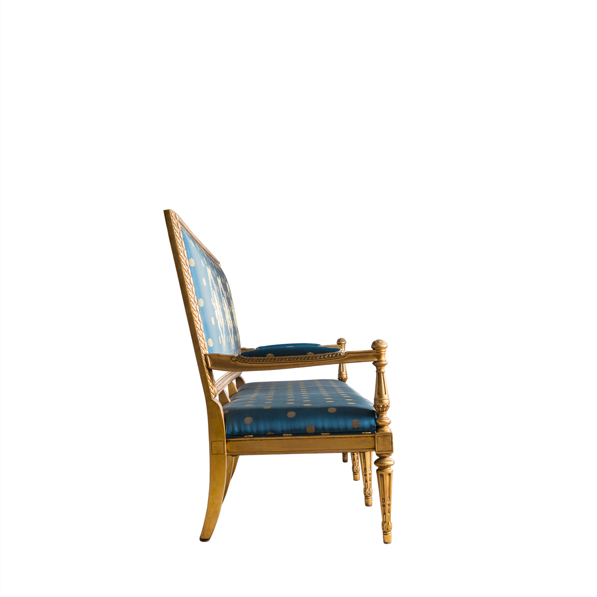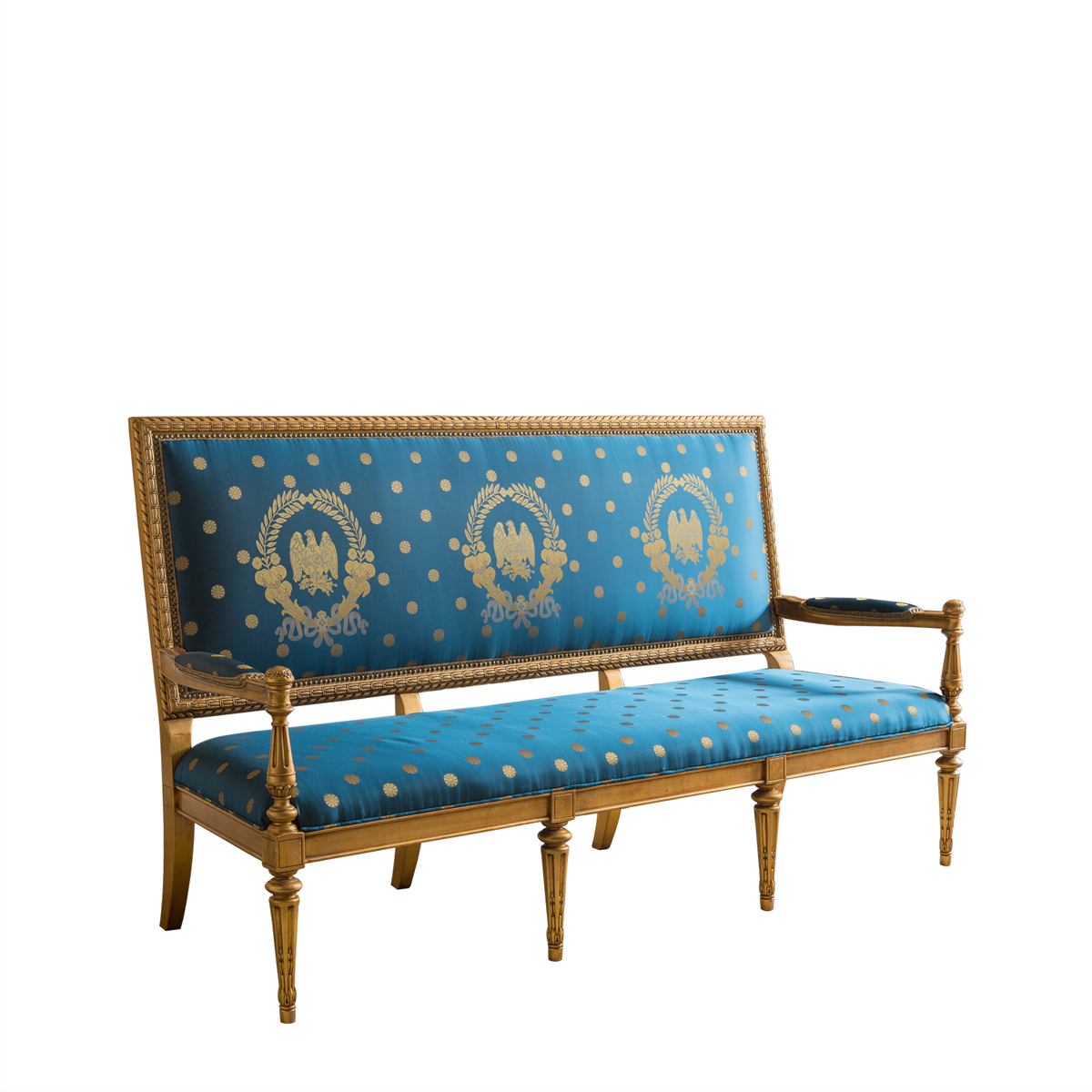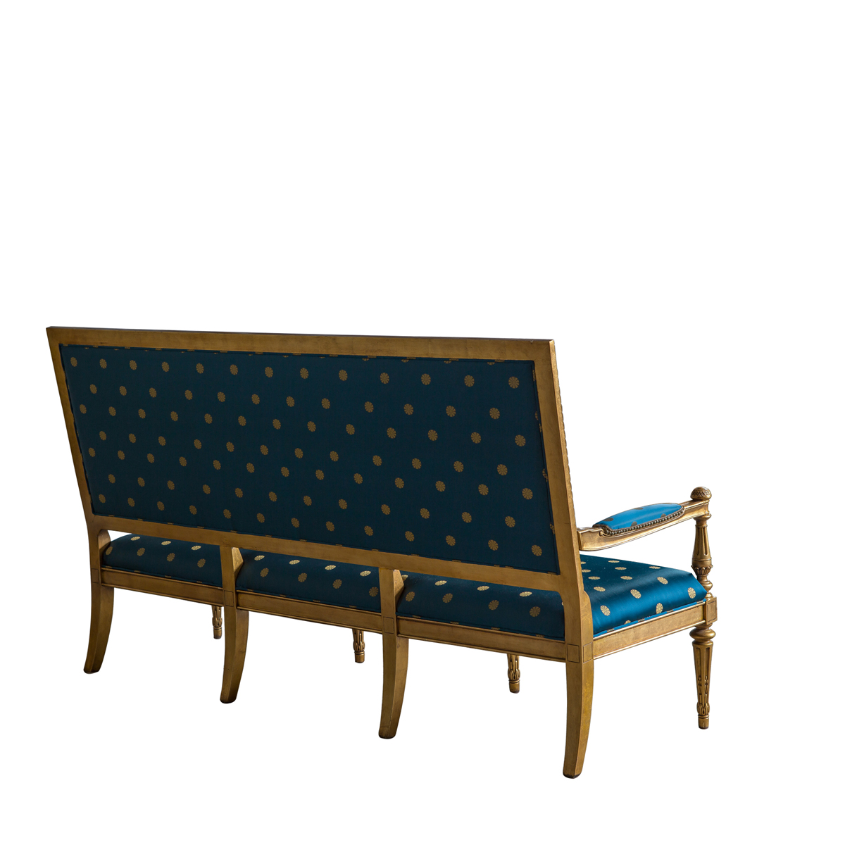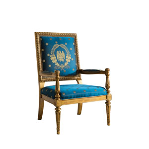 * 這是以美國白宮的Blue Room(藍(lán)色房間) 為意念并結(jié)合法國元素而設(shè)計(jì)的沙發(fā)。包括建筑雕刻錐形腳、 權(quán)杖狀的扶手柱、葉形雕刻外框和貼金鉑工藝,配上代表自由的藍(lán)色布藝和包有豐厚的填充物坐墊和靠背。