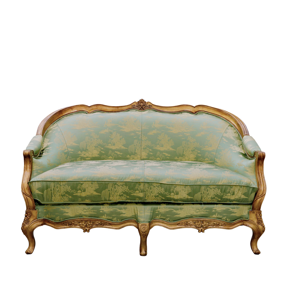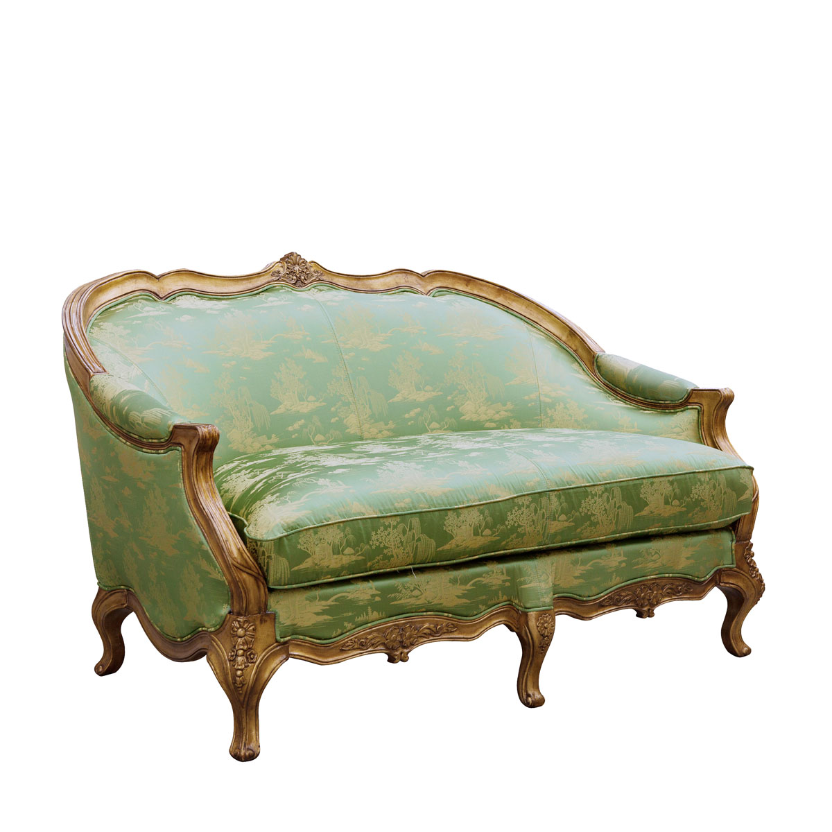 * 從法國十八世紀初攝政時期的風格中汲取靈感制作而成,采用了同風格的彎腳設計,阿坎瑟斯葉雕刻造型和金箔貼飾,再飾以中國山水圖案的絲綢和包有豐厚的填充物坐墊和靠背,使得這款沙發閃耀著華麗高貴的光環;