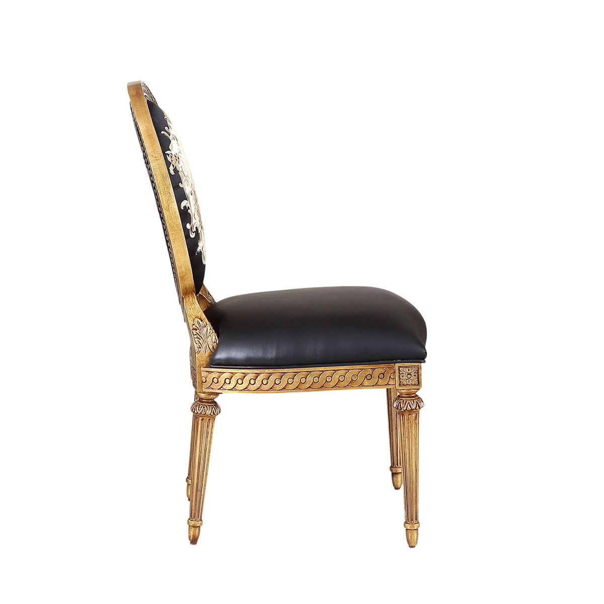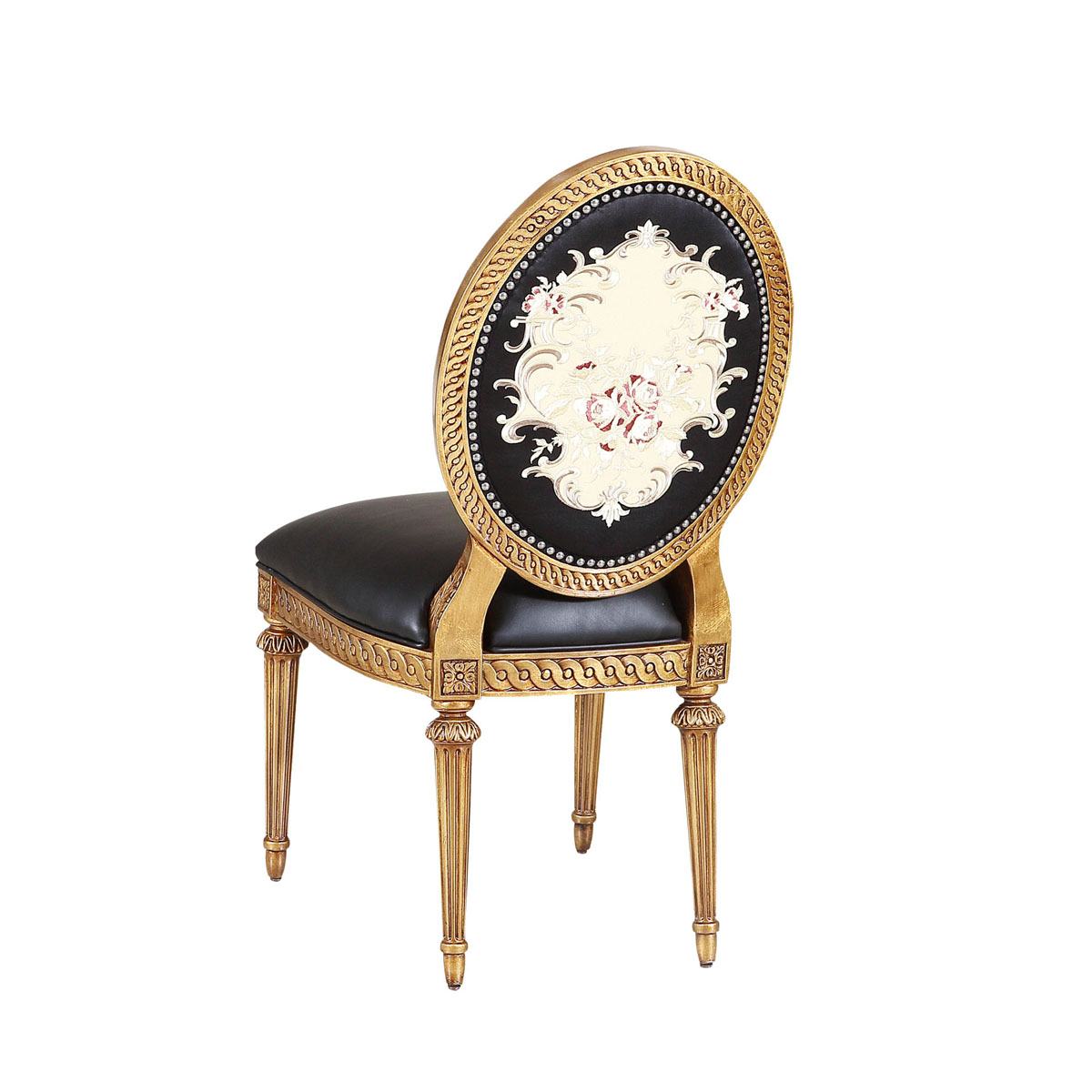 * 參考18世紀法國路易十六時期涂金扶手椅古董設計,并結合同時期的圓面背板設計。配上精致的連續雕刻和貼金鉑工藝、錐形腳設計、觸感舒適的布藝和包有豐厚的填充物坐墊和靠背。