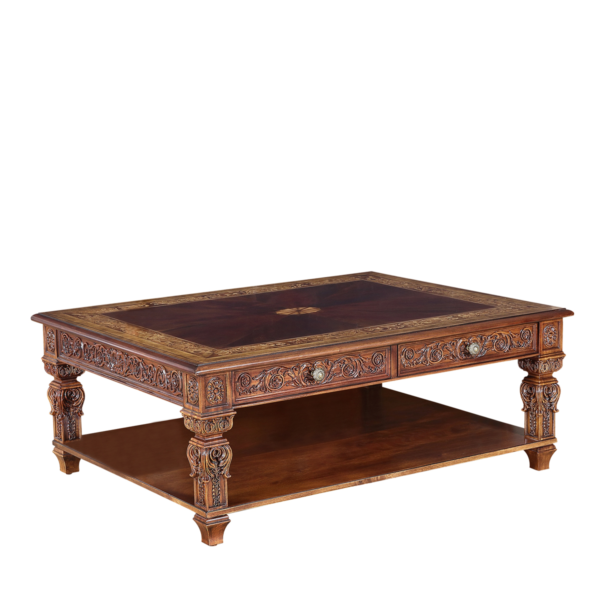 * 以現位于美國白宮中象征友誼和權力的堅毅桌(英語:Resolute desk)為設計意念, 以實木拼貼和雕刻工藝,將具有紀念意義的歷史時刻融入其中,實用性的功能設計更是把藝術和生活完美結合, 是宮廷系列華盛頓美式咖啡臺的特色。