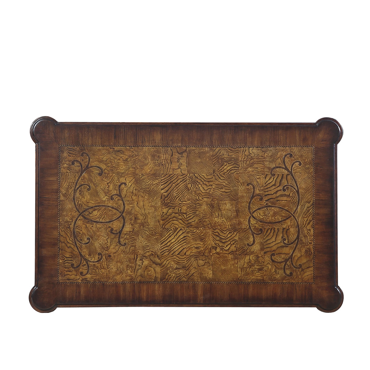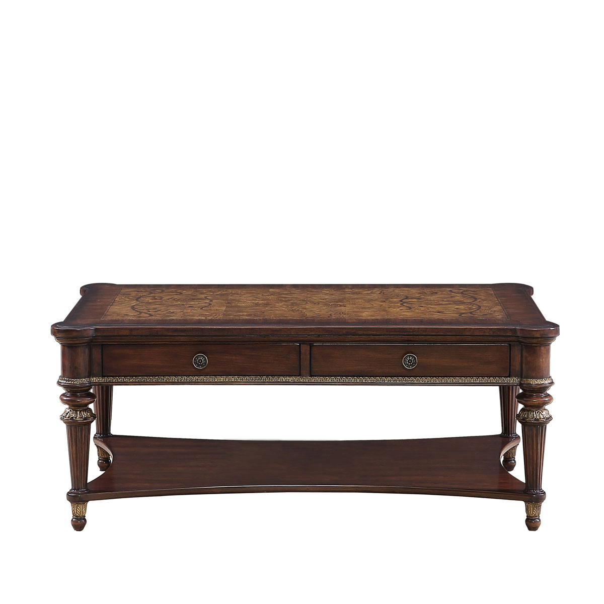 * 抓住意大利人對咖啡情有獨鐘的文化現象,咖啡桌采用了充分展現珍稀木材紋理的實木薄片拼貼,配上阿坎賽斯葉狀雕刻與描金工藝,精彩演繹了純正地道的意國風情。