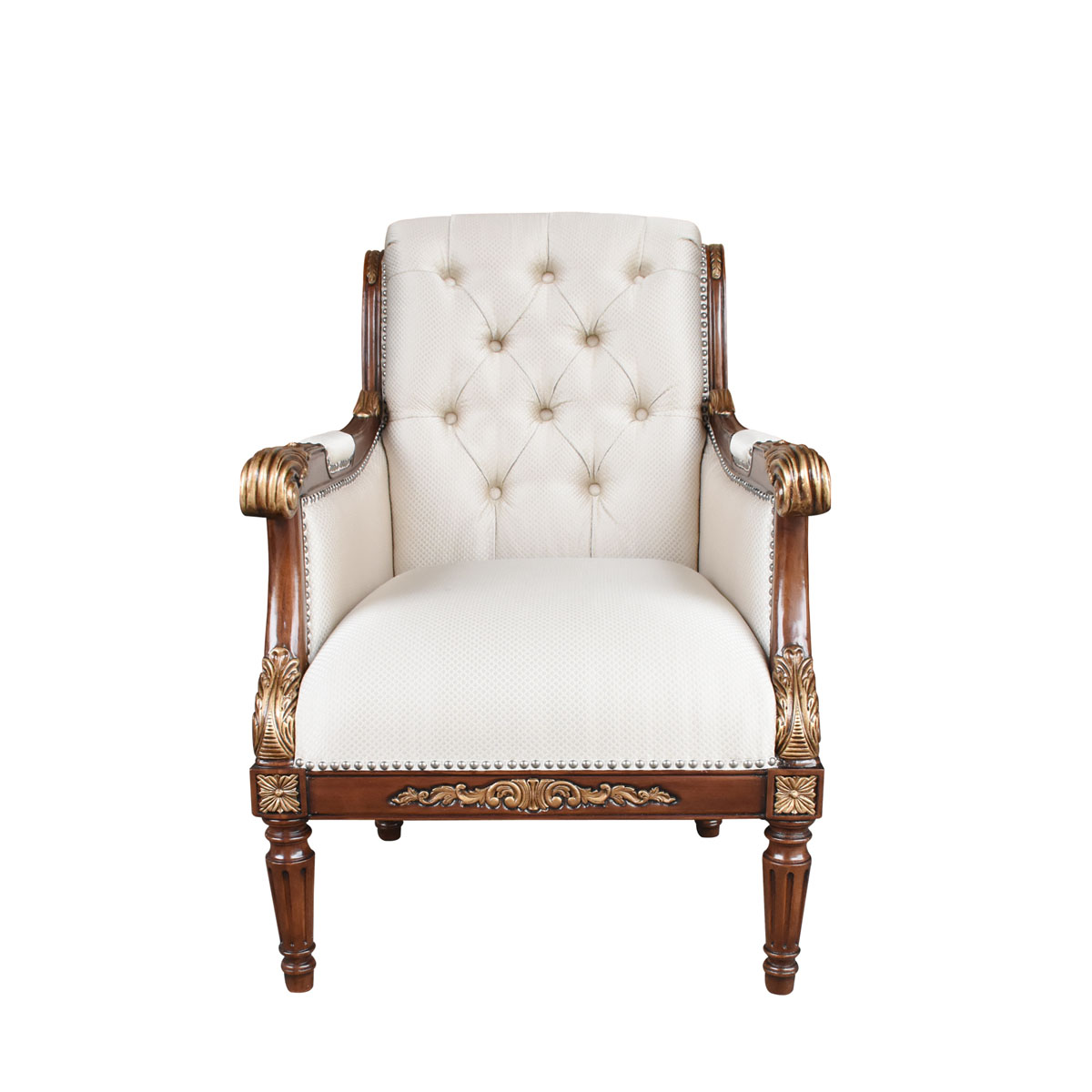 卷葉雕刻的扶手設計、舒適的椅背角度、細致的雕刻和貼金箔工藝。這款休閑椅是QueenVictoria(維多利亞女皇)時期的設計,我們還可以在她晚年的照片中找到它的蹤影。并配上觸感舒適的布藝和包有豐厚的填充物坐墊和靠背。