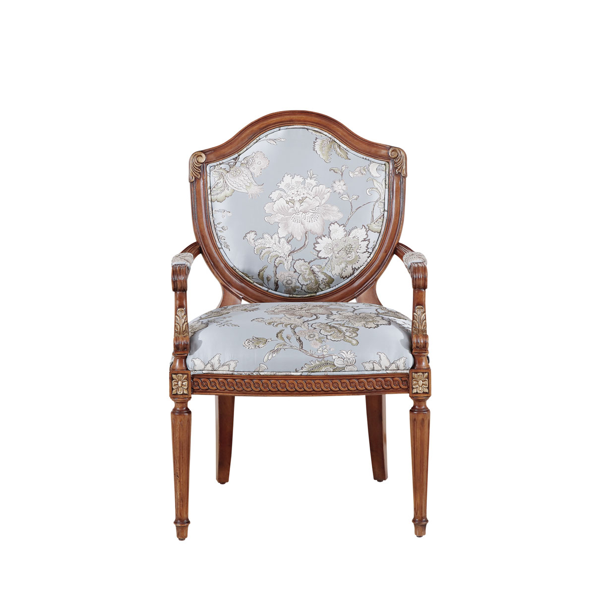 法國新古典和洛可可風格,盾型椅背造型簡約大方,建筑柱雕刻柱腿簡約的直線條造型,端莊大氣,花草藤蔓雕刻及印花布藝生機蔓延,充滿法國田園的自然氣息。